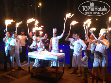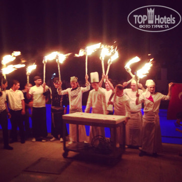 Еда посредственная, изысков не ждите, но голодными не останетесь. Плюс - фрукты (арбуз, яблоко, груша, апельсины, виноград) На ужин каждый день были блюда на мангале (курица, печень говяжья, рыба). Основное мое требование отелю - чистота. Персонал хорошо делает свою работу. Посуду убирают, столы протирают, стаканы и тарелки чистые. Номера очень уставшие. Мебель старая, плинтуса треснули. Видно что сделан косметический ремонт в холлах, но в номерах нет. Т.к. нас было 4 человека, нам дали номер на крыше, доезжаешь до 5 этажа, потом по винтовой лестнице еще наверх. Номер большой. Кондиционер за время нашего нахождения тёк, сообщали на ресепшен, нам его тут же починили. Убирали номер хорошо. Основной огромный минус (!!!!) - нет кондиционера в лобби, на ресепшене, в холле - НИГДЕ, кроме номеров! Просто "баня", невыносимо. Ждали номер, его дали только в 14.30, чуть не сварились. Выходишь из номера, и пока едешь на лифте весь мокрый!