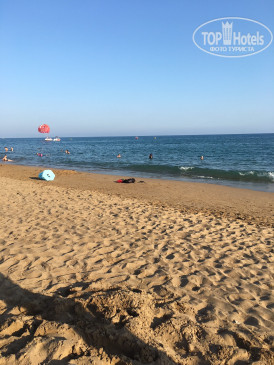 пешком далековато, особенно по жаре. Один раз шли пешком обратно - 30 минут, т.к. пол дороги асфальт, а пол дороги по бездорожью... Маршрутка от отеля каждый час кроме обеда, но был день, когда не забрала с пляжа в 17 ч, а приехала только на 18 ч ( ходит она с 10 до 18) . Лежаки и зоники на 3 - , но свою функцию выполняли. Всегда можно было найти свободное место. Есть туалеты, душ, кафе. От нашего отеля в кафе соки, типа, юпи и кофе или вода - бесплатно. Есть соседний бар, тосты, бургеры, картошка фри, пиво и мохито за деньги с приятным барменом. Пляж - песок, вход в море пологий, тоже песок. Были волны, вода мутноватая. Когда штормило - прибивало водоросли немного. Можно было полетать на парашюте за катером, на водных видах спорта, типа, банана или ватрушки, гидроцикл.