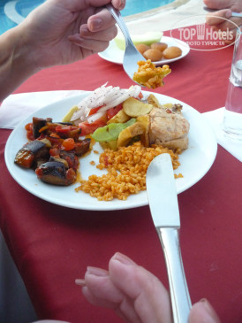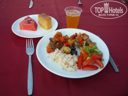 Завтраки - на 3-, обеды - 3+,4-,4, ужины - 4 и всегда только курица!, но готовит повар из того что есть хорошо, молодец!, Арбуз и яблоки, полдников нет, выручает круглосуточный аппарат чай-кофе и вкусные бублики\булочки по 1,25 Тур лире в магазинчике из отеля налево или сразу напротив. В баре пакетированные соки и это радует, правда 2 вида и с гигиеной у мальчика бывает не очень, просили мыть руки, и местное вино кр и бел с 12 до 21.