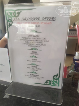Напитки в баре: их алкоголя бесплатно только вино, пиво, водка, джин, ликёр(когда мы были, он был персиковый), и абсент/все местного производства/; из безалкогольного местный лимонад а-ля пепси, 7ап и миринда, по вкусу они значительно слаще привычных нам, так же есть автомат с "соками", которые по факту порошковые и имеют химический вкус(вспомнился юппи из детства)