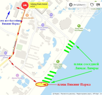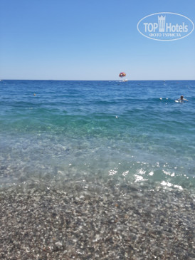 Если идти к этому пляжу по дороге, то сам вход на пляж закрыт на калитку, да, дойти все равно можно, но нам с коляской это было сделать невозможно, соответственно, приходилось ходить на "дальний" пляж, он недалеко, нужно пройти так же по дороге вдоль двух аквапарков, там уже попроще с заездом, так же, кажется, 10 раз в день ходит трансфер от отеля, мы им не пользовались