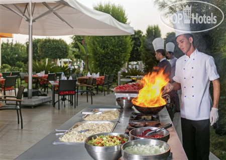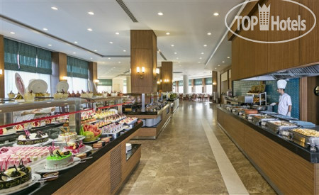 Питание в отеле на слабую 2ку. Мы не приветствуем перевод продуктов, но в этом отеле готовить не умеют, к сожалению. Хочется спросить руководство - вы сами пробовали, то что готовят в отеле? То, сто приготовлено на мангалах на улице - это есть невозможно ни в обед, ни на ужин, все пересушенное. На завтрак одно и тоже - яйца жареные, за которыми вечно очередь, яйца вареные. Оладьи, сосиски и колбасу есть невозможно. Неплохой выбор сыров, но с чем их есть? Каша из геркулеса, которую даже не нагрели, просто высыпали в молоко хлопья.... Выбор блюд в обед и ужин примерно одинаков. Неплохой выбор пироженых, но тоже однообразно. Удивило то, что в отеле не было привычного рахат-лукума и айрана. Они в Турции закончились видимо или отель сильно экономит. Уж этого добра в каждом отеле было всегда!